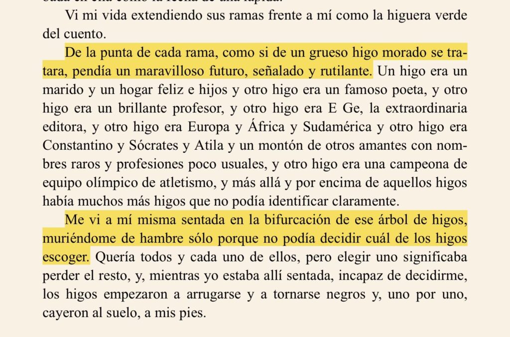 La angustia de Esther surge de su incapacidad para elegir un solo higo, un único camino. Su temor más profundo es que, al no decidirse por ninguno, todos los higos (es decir, todas las oportunidades) se marchitarán y caerán a sus pies, dejándola sin nada. Esta metáfora ilustra poderosamente la ansiedad inherente a la juventud y la adultez temprana, donde la abundancia de futuros potenciales, en lugar de ser liberadora, puede sentirse abrumadora y paralizante. Es como estar frente a un vasto bufé de opciones vitales y morir de hambre simplemente por no poder decidir qué poner en el plato.