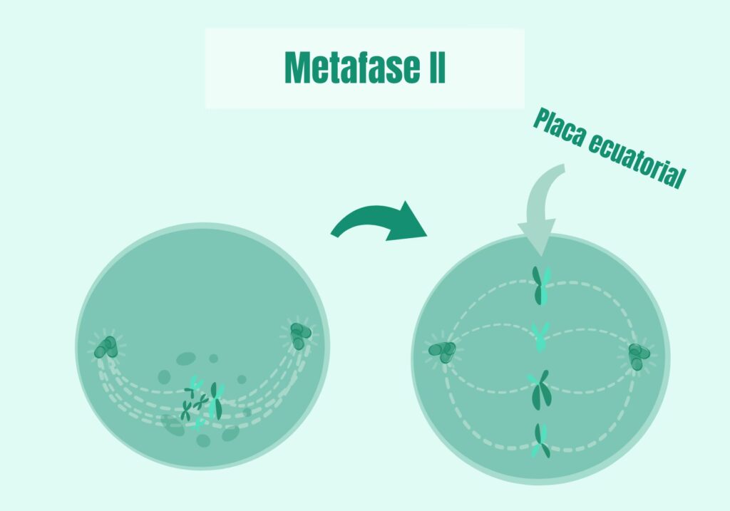 La metafase es el escenario donde los cromosomas se alinean en el plano ecuatorial de la célula, conocido como la placa metafásica. En la mitosis, las cromátidas hermanas de cada cromosoma duplicado se alinean individualmente a lo largo de esta placa. De manera similar, en la metafase II de la meiosis, los cromosomas (que aún constan de dos cromátidas hermanas) también se alinean individualmente en la placa metafásica, tal como lo harían en la mitosis. Por el contrario, en la metafase I de la meiosis, son los pares de cromosomas homólogos (tétradas) los que se alinean en la placa. Esta distinción resalta que la Meiosis II es, en esencia, una división mitótica de células haploides.