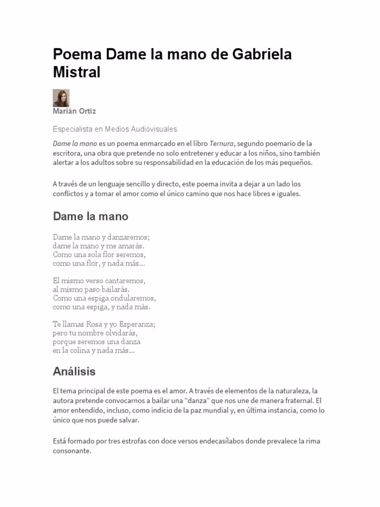- El poema "Todo es ronda" de Gabriela Mistral, parte de su libro Ternura, expresa la idea de una conexión universal y de la importancia del juego colectivo. Simboliza la unidad y la interdependencia entre todos los seres vivos y elementos de la naturaleza (niños, animales, plantas, astros, ríos, olas). Propone que el juego de la ronda es un acto espiritual y ritual que reproduce el ritmo vital del universo, fomentando la ternura y la sensibilidad hacia la vida y el entorno. Es una metáfora de la vida en comunidad y la armonía con el cosmos.