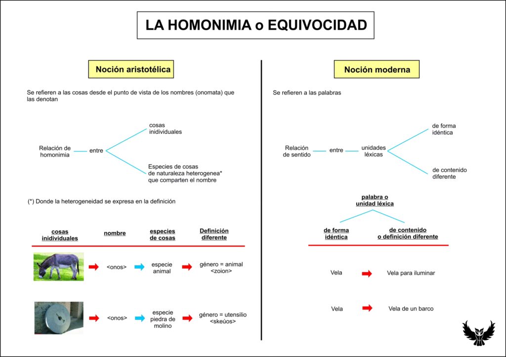 Por otro lado, la homonimia se produce cuando dos o más cosas tienen el mismo nombre, pero no la misma definición esencial. Volviendo al ejemplo de Aristóteles, el término "animal" se usa homónimamente para referirse a un ser humano y a un dibujo de un ser humano. Aunque ambos son llamados "animal", no lo son de la misma manera. El ser humano es un animal en un sentido biológico y sustancial, mientras que el dibujo es un "animal" solo por su representación, sin poseer las propiedades vitales de un animal real. El término, en este caso, señala propiedades completamente diferentes en cada uno. La homonimia, por tanto, indica la ausencia de un carácter común idéntico entre todas las instancias de cosas que llevan el mismo nombre.