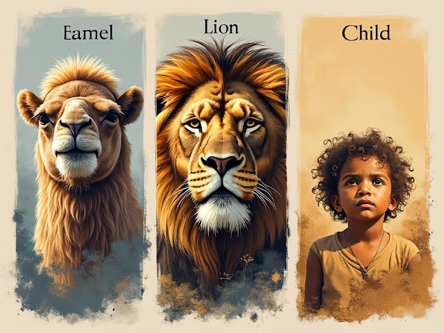 | Camello | Obediencia, sumisión, carga de valores ajenos, falta de identidad propia, dependencia. | Acepta el "tú debes"; veneración a la tradición y la moral establecida. | Conformidad, estancamiento, ausencia de voluntad propia. |