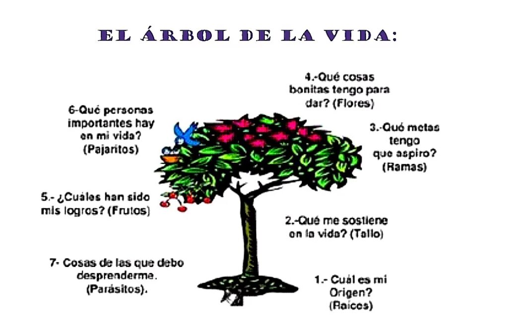 Las raíces representan el nacimiento y la conexión con la tierra y los ancestros. El tronco simboliza el crecimiento, el desarrollo personal y la fortaleza. Las ramas representan las decisiones tomadas y los diferentes caminos de la vida. Las hojas, si están presentes, pueden simbolizar la abundancia, la vitalidad y el conocimiento.