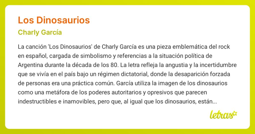 Durante los años de plomo, la música y el arte en general se convirtieron en un refugio y, a la vez, en un campo de batalla. La censura era implacable, y muchos artistas tuvieron que exiliarse o recurrir a la sutileza para expresar su descontento. Charly, con su ingenio, lograba sortear las prohibiciones, utilizando el doble sentido y la metáfora como herramientas de resistencia. Canciones como "Dinosaurios" o "Los Sobrevivientes" ya habían establecido su postura crítica.